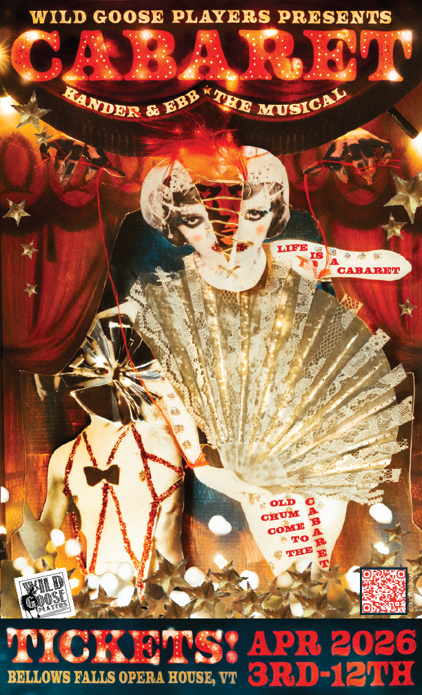 The Wild Goose Players bring "Cabaret" to the Bellows Falls Opera House. Winner of 8 Tony Awards including best musical, this masterpiece uses the decadent nightlife of 1920's Berlin as a backdrop for the rise of fascism. Welcome to the Kit Kat Klub, where life is beautiful....